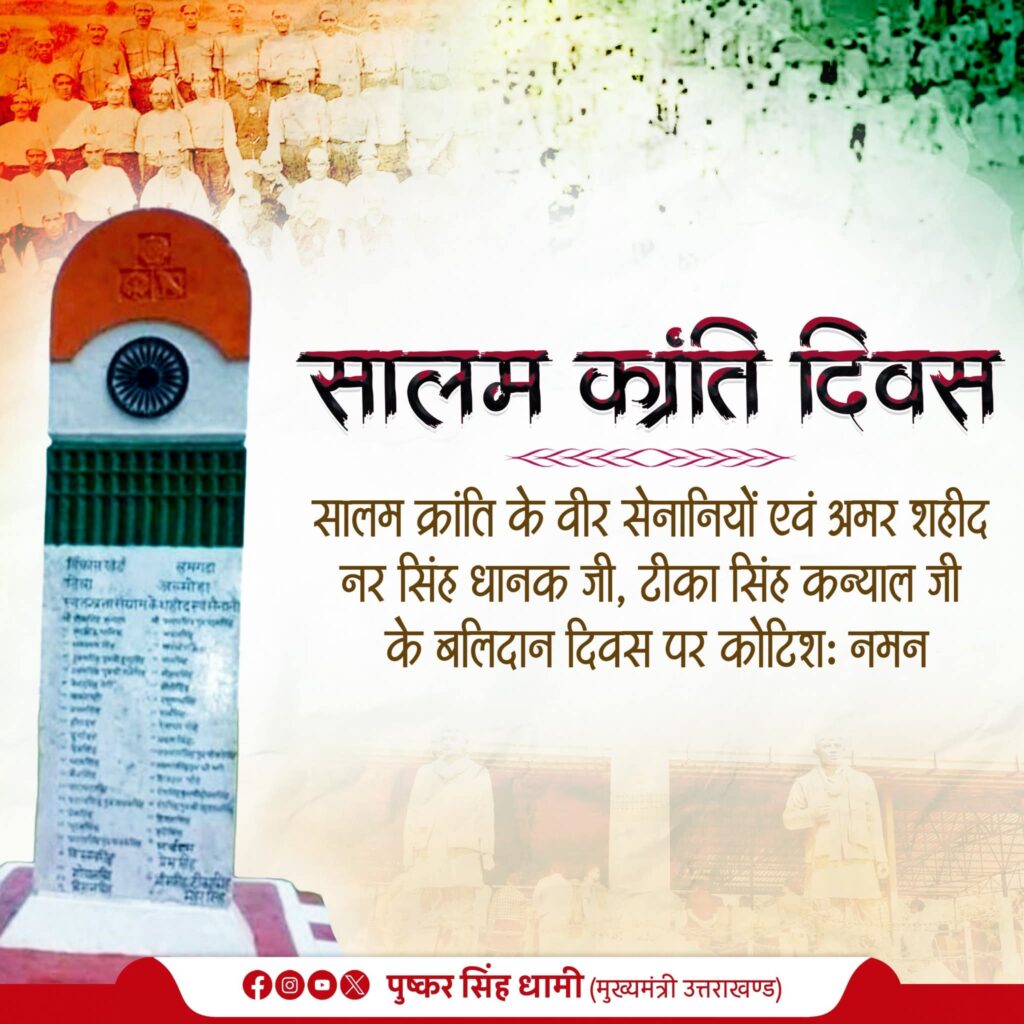 मुख्यमंत्री पुष्कर सिंह धामी सालम क्रांति दिवस पर उन अमर वीर सेनानियों को कोटिशः नमन, जिन्होंने आज़ादी की राह को अपने साहस और त्याग से प्रकाशित किया। 25 अगस्त 1942 को सालम की धरती पर नर सिंह धानक जी और टीका सिंह कन्याल जी ने मातृभूमि की स्वतंत्रता के लिए अपने प्राणों का सर्वोच्च बलिदान दिया।